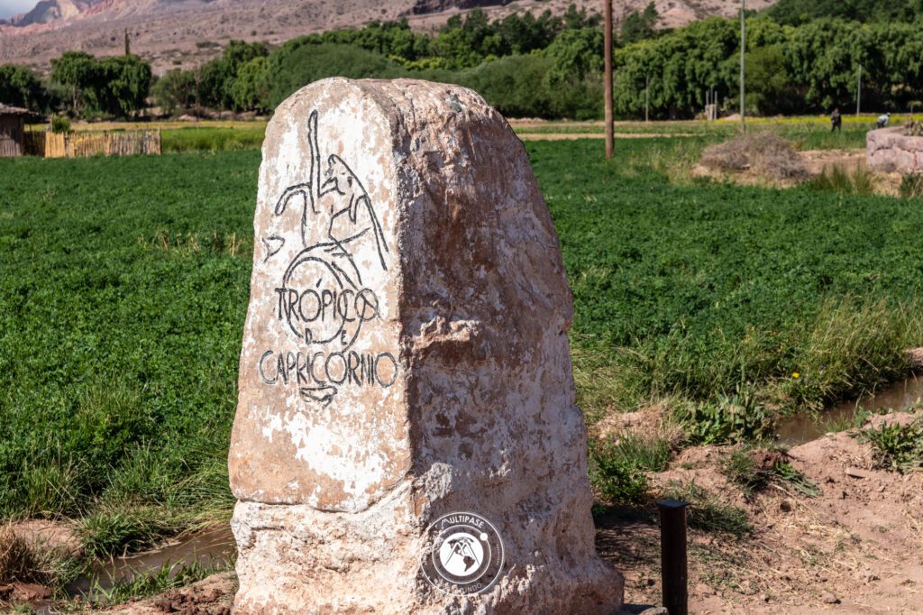 Hicimos la primera parada en el trópico de capricornio en Huacalera, pueblo de la Quebrada de Humahuaca, en la provincia de Jujuy. Aquí también se encuentra un reloj solar. El Trópico de Capricornio es una línea imaginaria, al sur del Ecuador, que junto con el Trópico de Cáncer comprenden la llamada zona intertropical. El monolito del Trópico de Capricornio (que debería llamarse trópico de sagitario) está situado al costado de la Ruta Nacional 9, En este trópico los rayos del sol caen de forma vertical sobre el suelo (el sol queda perfectamente en línea recta a la tierra) al momento de ocurrir el solsticio de diciembre. Aquí año tras año se celebra el Inti Raymi o Fiesta del Sol (festividad de origen incaico que fue prohibida en su momento por los conquistadores españoles en Perú); donde las comunidades andinas celebran, cada 21 de junio, el solsticio de invierno. Si bien solo hay un pequeño monolito su significado es muy interesante.