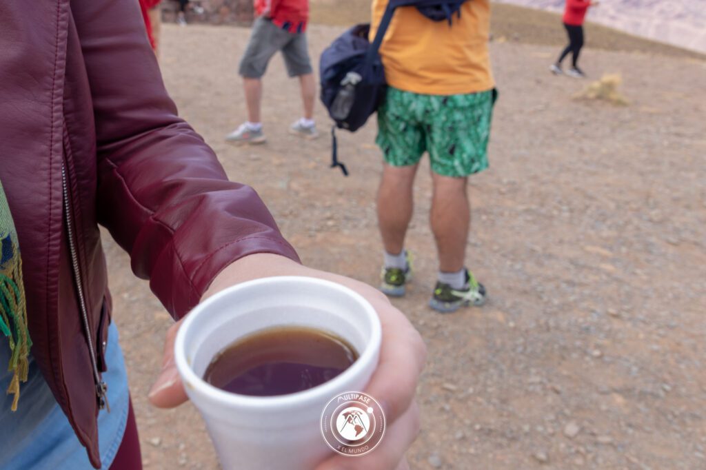 Y así llegamos a los 4350 metros sobre el nivel del mar, para ver este impresionante cerro de los 15 colores que se nos presentaba cual pintura frente a nosotros. A bajar con cuidado y caminar tranquilo, despacio, ya que a esta altura el oxigeno es menor y nos cansamos más rápido. Ahora entendemos la paciencia de estos pueblos tanto al andar como al caminar. Una vez aclimatados disfrutamos estos bellos paisajes con nuestros ojos y por supuesto sacamos muchas fotos para llevar registro de tan linda vista. Nos ofrecieron un té de coca, para calentar el cuerpo y que funciona como un estimulante, así como el café, para mantenernos atentos y no apunarnos por la altura.